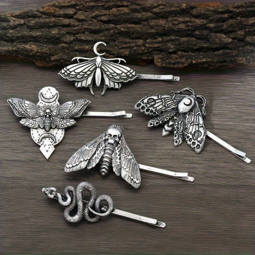 Add a touch of dark elegance to your look with this set of five silver Victorian-inspired insect hair pins. Featuring intricately detailed beetles, moths, and other creepy crawlers, these antique silver-tone accessories channel vintage gothic glamour with a hint of the macabre. Perfect for updos, braids, or scattered through loose waves, each pin is lightweight, durable, and designed to hold your style with eerie sophistication.